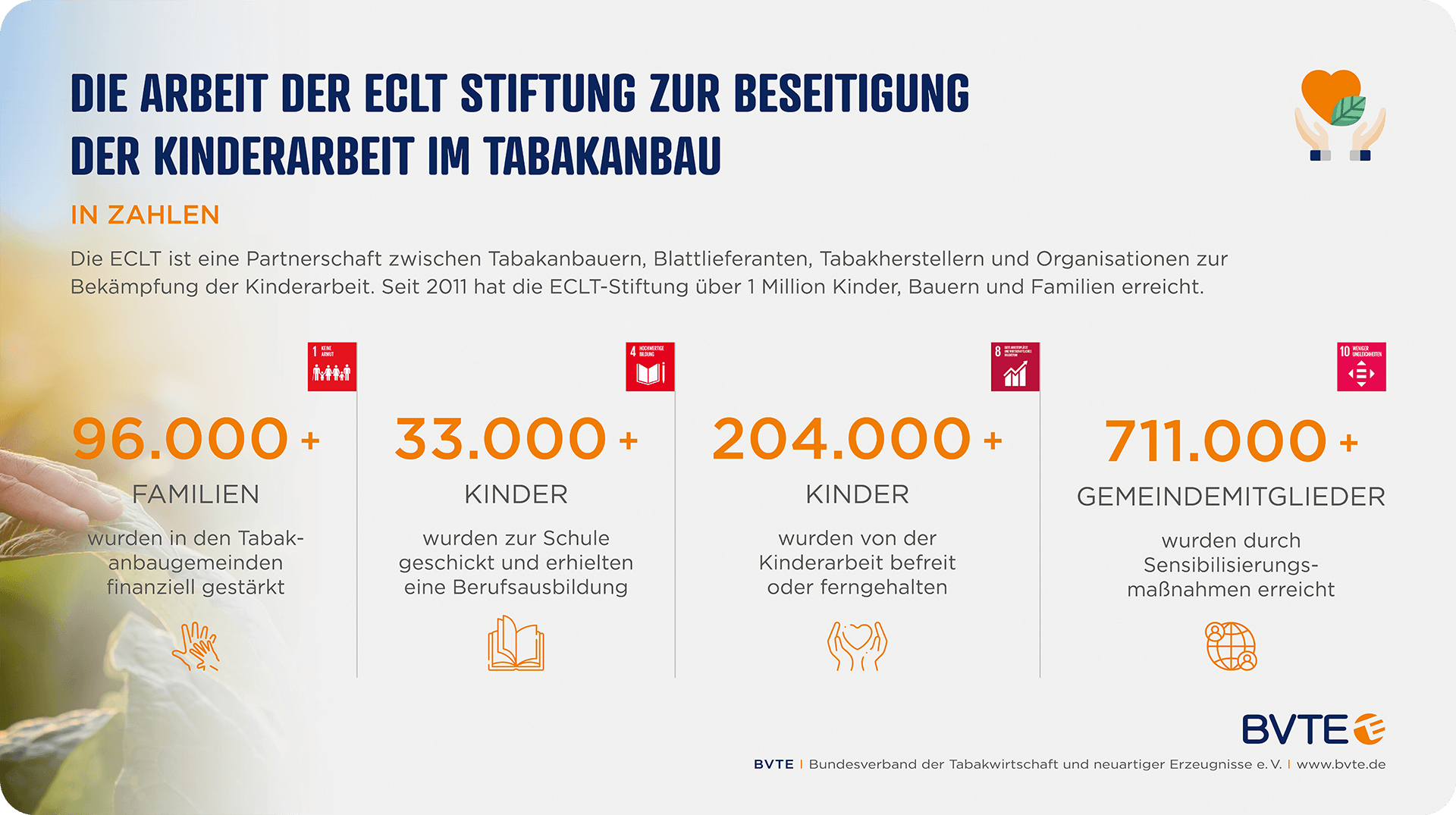 Unsere Mitgliedsunternehmen dulden keine Kinderarbeit und engagieren sich für deren Bekämpfung durch eine Reihe von Initiativen und Programmen, um Kinderarbeit in all ihren Formen in ihrer Wertschöpfungskette zu beseitigen. Die Tabakerzeuger wollen zusammen mit anderen relevanten Akteuren ihren Teil zur Lösung dieses komplexen Problems beitragen.